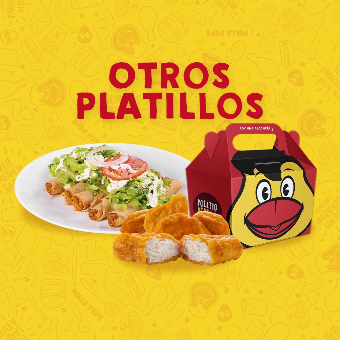 Contamos con otros platillos que se adaptan al gusto de todos los Nuggets de pollo que contempla una orden de 9 y por supuesto los tradicionales y clasicos tacos dorados de pollo asado la orden de 5 tacos dorados de pollo asado y la orden de 10 tacos dorados de pollo asado y para los mas pequenos de la casa: Combo Jr. Pepe que es una comida para ninos: con 6 crujientes nuggets, papas chicas y bebida individual y una sorpresa y