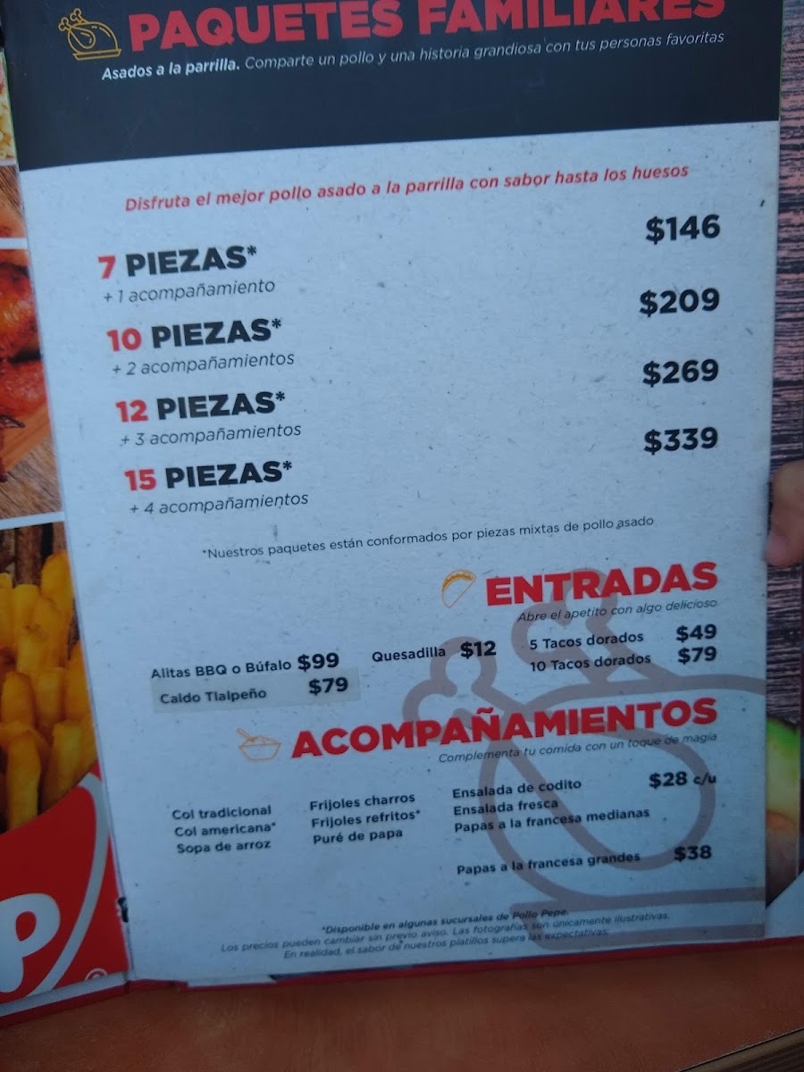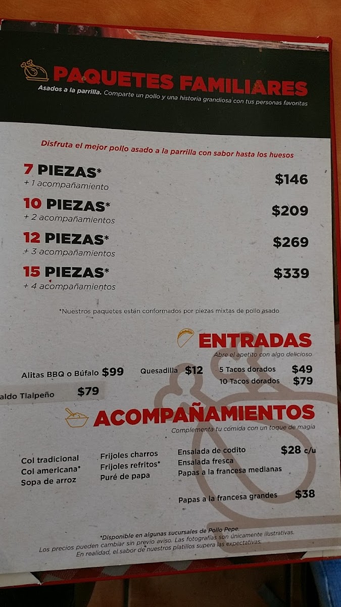 Con mas de 40 anos de experiencia siendo los expertos del pollo asado contamos con diversos paquetes familiares, que puedes pedir a traves de servicio a domicilio o directamente desde nuestra tienda online de Pollo Pepe nuestros paquetes familiares que incluyen 7 piezas de pollo asado que es medio pollo asado y un cuarto de pierna y muslo mas 1 acompanamiento, 10 piezas que es un pollo asado completo mas 2 acompanamientos. 12 piezas que es un pollo y un cuarto de pierna y muslo mas 3 acompanamientos. 15 piezas que es un pollo asado completo y medio pollo asado mas 4 acompanamientos. Todos los paquetes familiares incluyen tortillas, y la tradicional salsa de jitomate o la salsa asada con jitomates asaditos y chiles.