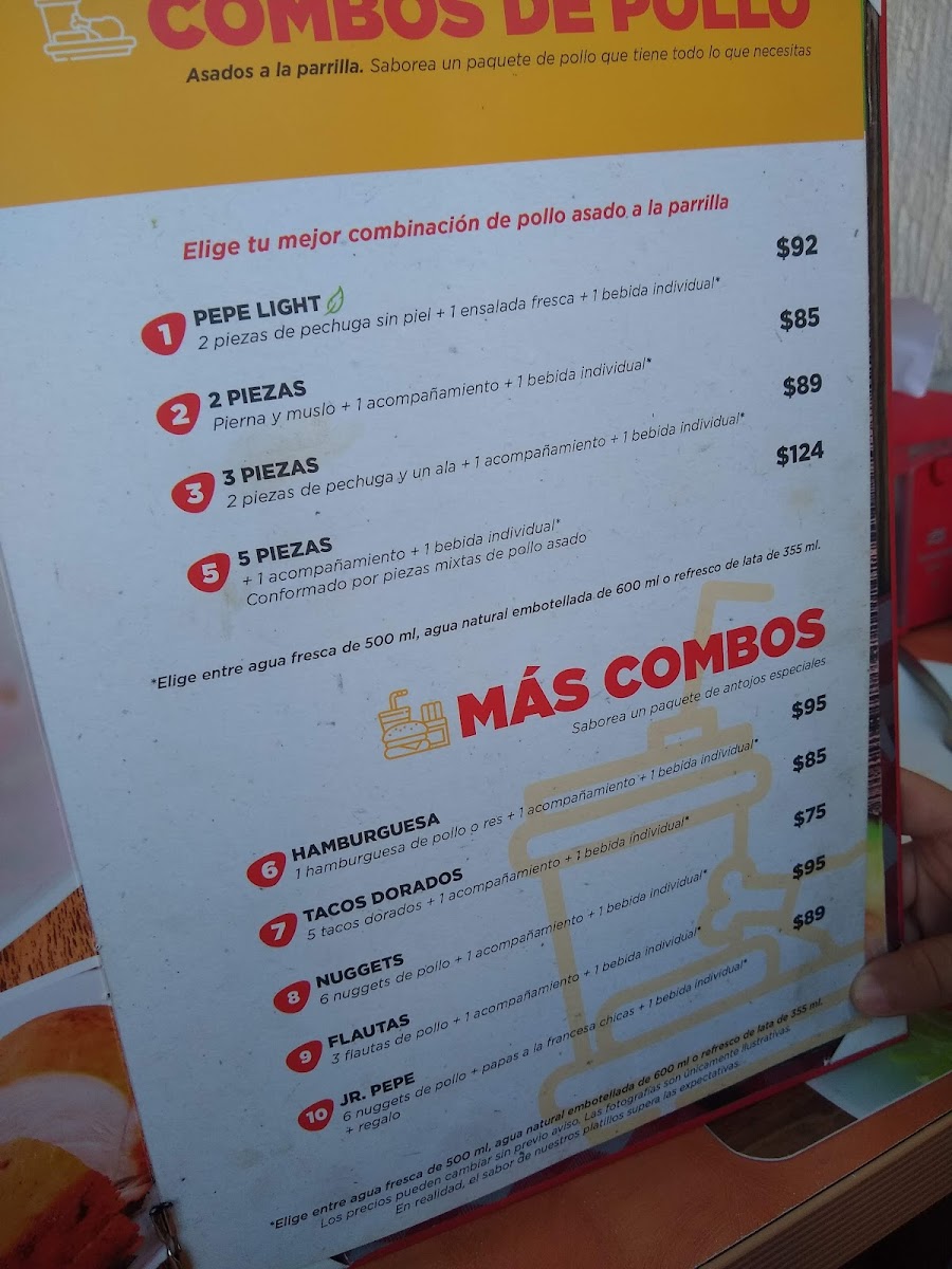 Estos combos individuales estan hechos para ti, los expertos en pollo asado desde 2 piezas que es un cuarto de pollo asado de pierna y muslo mas un acompanamiento y una bebida. 3 piezas que es un cuarto de pollo asado de pechuga y ala mas un acompanamiento y una bebida. 5 piezas que es medio pollo asado mas un acompanamiento y una bebida. Los combos individuales de pollo asado incluyen tortillas, salsa de jitomate o salsa asada. Otro de los destacados de combos individuales es el Pollo Pepe Light: 215 gramos de pechuga de pollo asado sin piel mas una ensalada fresca y una bebida. y uno de los combos tradicionales y el combo individual preferido por muchos, las flautas de pollo asado: 3 flautas de 15 cm, hechas con tortilla raspada, rellenas con guiso de pollo mas un acompanamiento, y una bebida individual.