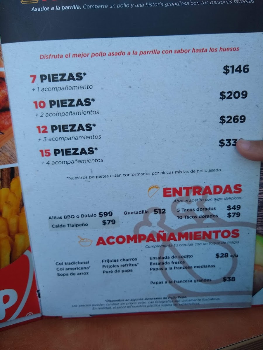 Contamos con nuestros tradicionales acompanamientos que se han convertido en un ana tradicion en Pollo Pepe como la sopa de arroz: Arroz rojo con chicharos, elote y zanahoria en cubitos, la ensalada de col tradicional: Cremosa mezcla de col blanca y zanahoria, la ensalada de codito: Mezcla sabrosa de pasta de coditos, chicharos, elote, zanahoria y jamon en cubitos ademas del clasico Pure de papa banado en sabroso gravy, los Frijoles charros: Frijoles de la olla cocinados a fuego lento con salchicha, tocino, chorizo, cebolla, cilantro y jitomate, la ensalada de col americana: vegetales seleccionados con una cremosa mezcla de col americana y zanahoria, la ensalada fresca: vegetales seleccionados: lechuga romana, zanahoria, pimiento, apio, col morada, tomate cherry y pepino y las papas a la francesa Extracrujientes, hechas con puras papas selectas.